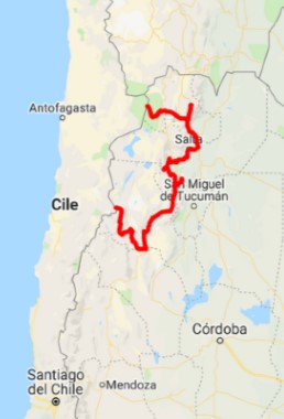 Paso San Francisco – Fiambalá – El Puesto – Tinogasta – El Shincal – Belen – Pucarà di Quilmes – Quebrada del Río de las Conchas – Cafayate – Valle Calchaquies – Estancia Colomé – Molinos – Cachi – Parque Nacional Los Cardones – Cuesta del Obispo – Salta – San Salvador de Jujuy – Quebrada de Humahuaca – Maimará – Uquia – Humahuaca – Hornocal – Pumamarca – Cuesta de Lipán – Salinas Grandes – Paso Jama – Frontiera Argentina/Cile