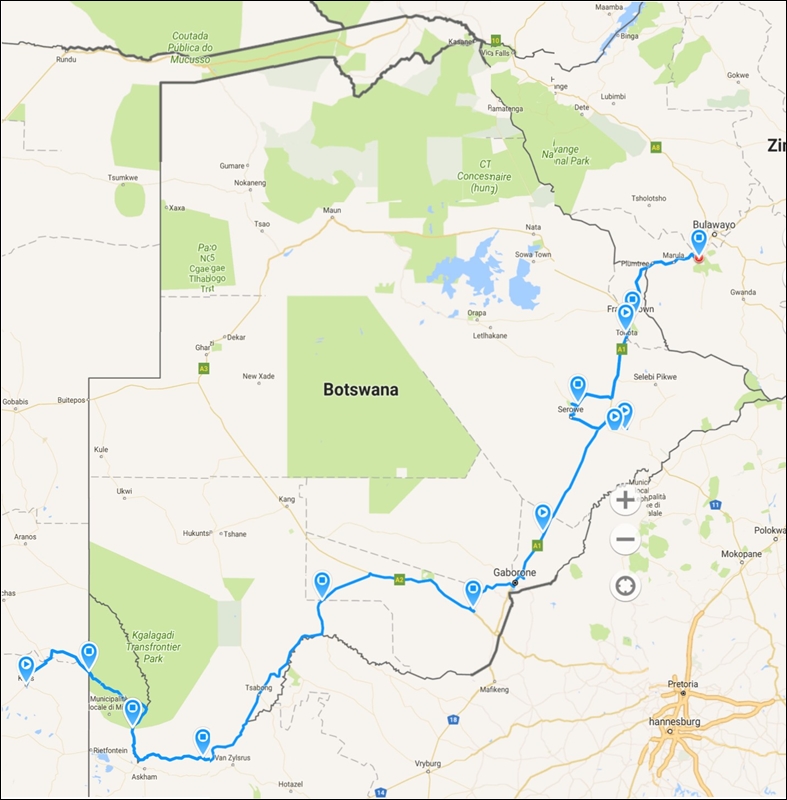 Frontiera Namibia/Sudafrica/Botswana Mata-Mata e Tween Rivieren (Kgalagadi Transfrontier Park) – Kanye – Gabane – Gaborone – Old Palapye – Serowe – Francistown – Frontiera Ramokwebane Botswana/ Plumtree Zimbabwe