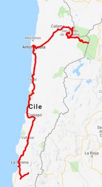 Frontiera Paso Jama – San Pedro de Atacama – (Osservatorio ALMA) – Valle del Arcoiris – Geyser El Tatio – Calama – Antofagasta – Cerro Paranal (Osservatorio ESO) – Parque Nacional Pan de Azúcar – Reserva Natural Municipal Granito Orbicular – La Serena – Coquimbo – Morillos.