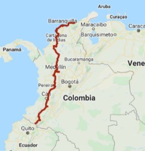 Rumichaca Frontiera Ecuador/Colombia – Las Lajas – Ipiales – Laguna de la Cocha – El Puerto – Parque Nacional Santuario de Flora Isola Corota – El Estrecho – Popayán – Silvia – La Estrella – Salento – Valle de Cocora – Filandia – Pereira – Jericó – Fredonia – Amagà – Tres Puerta – Medellín – Piedra del Peñol – Guatapé – Santa Rosa de Osas – Mata Puerco – Cartagena de Indias – Puerto Velero – Baranquilla – Santa Marta – Palomino