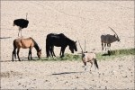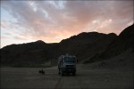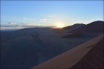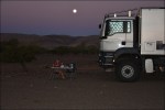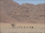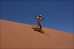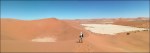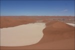 Levataccia e partenza alle 05.30 per vivere l’alba dalla duna n° 45 (significa che si trova al 45esimo chilometro). Dopo aver scalato i 150 m di dislivello, la fatica è ripagata dalle magnifiche luci e ombre e dalle variazioni di color rossastro della sabbia. Torniamo sul Nimbus e percorriamo gli altri 15 km sulla strada fino ad arrivare al parcheggio per gli autoveicoli 2WD. Gli ultimi quattro chilometri sono percorribili solo con vetture 4×4 (vietato ai camion e ai bus). Facciamo colazione e poi prendiamo la navetta che ci porta a Sossusvlei. Sono le 10h30 e, anche se è tardi e tutti stanno ritornando, decidiamo di scalare la duna Big Daddy. La temperatura non è troppo elevata, e un bel venticello ci accompagna. Attraversiamo così il “lago bianco” e dopo una ventina di minuti iniziamo la salita vera e propria. Copriamo il dislivello di 230 m e poi ci gustiamo il pic-nic con la vista sulle cime delle altre dune. La discesa è veloce e divertente e ci porta dritti dritti alla Dead Vlei che attraversiamo facendo tanti scatti fotografici. Arriviamo al parcheggio con la navetta e decidiamo di passare lì qualche ora. Si avvicina un bellissimo esemplare di orice femmina, probabilmente attratta dal gocciolio dell’acqua di scarico del nostro lavandino. Proviamo a riempire la ciotola utilizzata per dissetare gli uccellini e a metterla a pochi metri dal Nimbus. Lei si avvicina, beve e poi le dà una zoccolata. Quando si allontana, Renato va a prendere la ciotola, la riempie e la riposiziona. L’orice ritorna e beve nuovamente, appena finito, si allontana di qualche metro … e la cosa va avanti per una decina di volte! Rientrati a Sesriem si accosta un furgoncino VW rosso: sono Karin e Beni (beniundkarininafrika.blogspot.com), due giovani grigionesi a zonzo in Africa per qualche mese. Renato prepara un buon risottino per tutti e passiamo una bella serata.