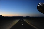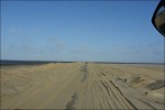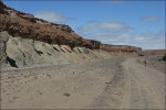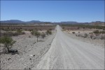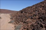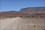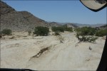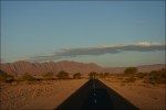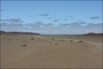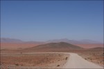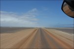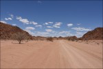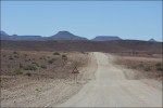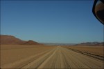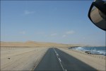 Riprendiamo la strada salina della Skeleton Coast, denominata salina poiché il fondo stradale sembra asfalto, ma in realtà è costituito da una miscela di gesso amalgamato con sabbia o ghiaietto e acqua salata, il tutto cotto al sole. Questo composto è incredibilmente liscio e in effetti, sembra una strada perfettamente asfaltata che però quando piove diventa assai scivolosa.