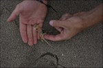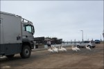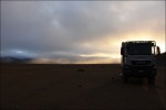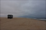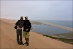 I turisti che si recano a Walvis non possono mancare di visitare anche Sandwich Harbor, dove il deserto incontra l’oceano. Dopo aver appurato che il nostro Nimbus sarebbe troppo pesante per arrivarci, ci siamo accordati con una guida locale che ci ha portato con il suo fuoristrada Nissan Patrol. Il viaggio è bello e a tratti a bordo mare. Arrivati alla laguna, saliamo sulla duna alta una settantina di metri. Una faticaccia! La vista è stupenda ma purtroppo il cielo grigio spegne i colori. Al ritorno, John ci delizia con un su e giù dalle dune e stana un Geco che ha un corpo semi-trasparente.