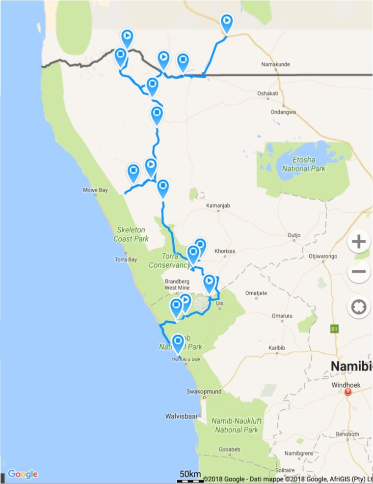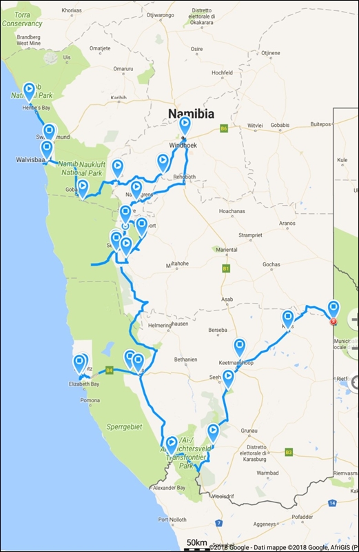 Swakopmund – Moonlandscape e Welwitschia Drive – Walvis Bay – Sandwich Harbour – Gobabeb – Kuiseb Canyon – Gamsberg Pass – Windhoek – Spreetshoogte Pass – Solitaire – Sesriem e Sossusvlei – Naukluft Mountain National Park – Garub Wilde Horses – Lüderitz – Kolmanskop Ghost Town – Aus – Orange River – Fish River Canyon – Naute Dam – Keetmanshoop – Frontiera Namibia/Sudafrica Mata-Mata (Kgalagadi Transfrontier National Park)