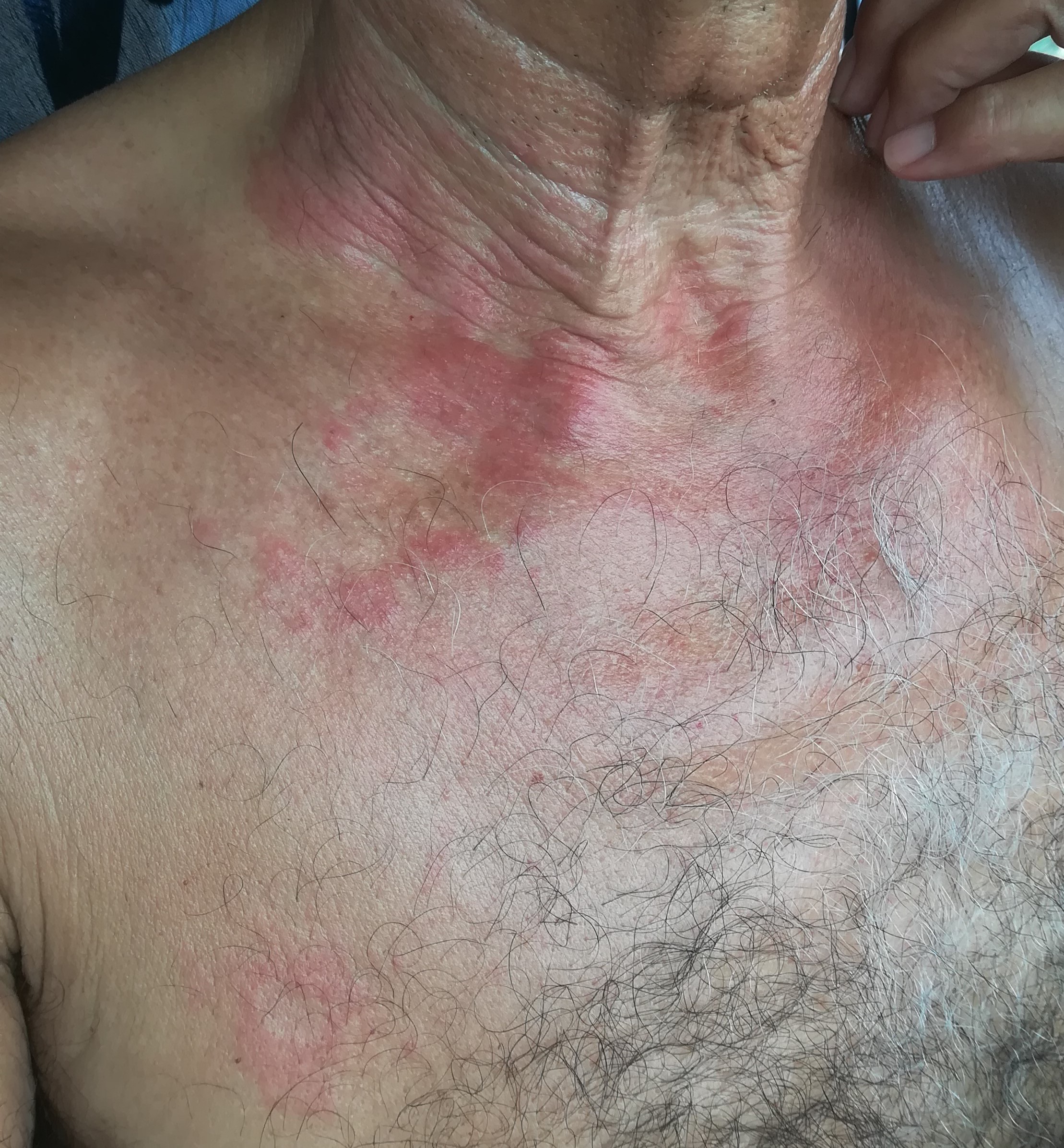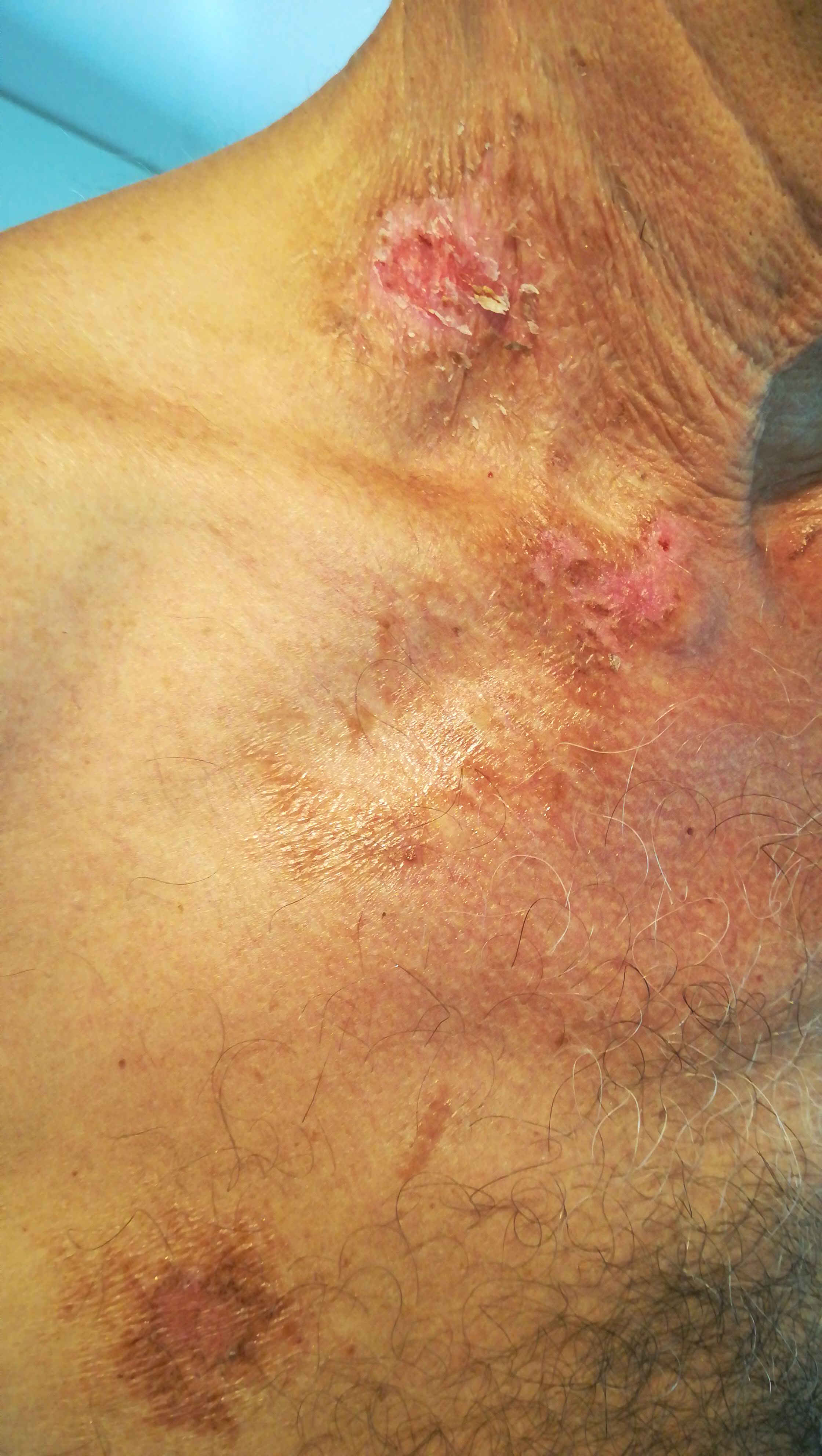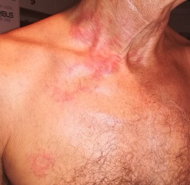 Abbiamo appena cenato e ancora seduto al tavolo sento un insetto che sul torace mi cammina sotto la maglietta. Lo prendo con le dita e istintivamente lo schiaccio. Al mattino mi sveglio con delle macchie rosse sul collo, sul torace e sul braccio: sembra una scottatura solare ma il centro della macchia piuttosto biancastro indica altro.