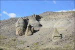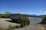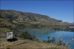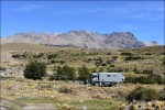 Ripercorriamo quindi a ritroso i 700 km sulla ventosa R40. In pianura, il Nimbus consuma 25 l/100 km, con il forte vento contrario il consumo raddoppia! All’altezza dello svincolo per “La Cueva de las Manos” prendiamo la pista a ovest che ci porta a Lago Posadas. Avremmo voluto fermarci qui qualche giorno ma Gloria, che soffre il mal di mare, mal sopporta le raffiche di vento che sbattono contro la nostra casetta. Da qui percorriamo una pista molto panoramica che costeggia il Cile e si snoda tra le montagne. Strane conformazioni rocciose dai colori che passano dal verde, al giallo al viola e marrone ci obbligano a fermarci più volte per cercare di immortalare questi magnifici paesaggi non solo nel nostro cuore ma anche nell’obbiettivo della macchina fotografica.