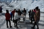 A vent’anni di distanza della nostra visita al ghiacciaio Perito Moreno, la sua bellezza e maestosità non mancano di emozionarci nuovamente. Questo ghiacciaio è uno dei pochi che non si ritira, la sua lunghezza di una trentina di chilometri gli permette di avanzare, nella parte centrale, di circa 2 metri al giorno. Per questo motivo è frequente la rottura di grossi blocchi di ghiaccio che, con grande fragore, si tuffano nel Lago Argentino. L’altezza del ghiacciaio che affiora dall’acqua, in taluni punti raggiunge i 70 metri (come un palazzo di oltre venti piani) e il suo fronte è di 5 km. Il movimento del ghiacciaio che scende a valle per forza di gravità, esercita un`intensa azione erosiva sulle rocce del suo letto le quali generano un fine pulviscolo di minerale denominato “farina di roccia”. Le particelle sono talmente fini che, quando il ghiaccio si scioglie, esse non sedimentano e rimangono in sospensione nell’acqua, riflettendo i raggi solari. Ecco perché l’acqua proveniente dai ghiacciai ha questo magnifico colore. Un vasto percorso di passerelle dà la possibilità di ammirare il ghiacciaio da vicino ma non ci lasciamo sfuggire l’emozione di un mini-trekking su di esso.