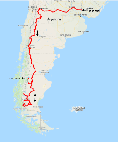Frontiera Fray Bentos Uruguay/Argentina – Gualeguaychu – Rosario –Villa Mercedes – Paso de Las Carretas – Mendoza – Tupungato – Paso de Los Puntanos – San Rafael – El Nihuil – Cañon del Atuel – San Rafael – Los Reyunos – Saline del Diamante – Malargüe – Chos Malal – Las Lajas – Villa Pehuenia – Lago Norquinco – Lago Huechulafquen – Junín de los Andes – San Martin de los Andes – Villa La Angostura – San Carlos de Bariloche – Colonia Suiza – Villa Catedral – El Bolsón – Perito Moreno – Cañon del Rio Pinturas e Cueva de las Manos – Gobernador Gregores – El Chaltén (Fitz Roy) – El Calafate – Ghiacciaio Perito Moreno – Frontiera Paso Rio Don Guillermo Argentina/Cile – Parco Nazionale Torres del Paine – Frontiera Paso Rio Don Guillermo Cile/Argentina – Ruta 40 verso nord – Lago Posadas – Los Antiguos