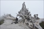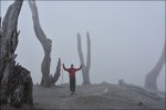 Raggiungiamo poi Chaitén e andiamo a visitare il sito storico in cui si possono ancora vedere – su alcune case – le conseguenze dell’eruzione del vulcano Chaitén. Fino al 2 maggio del 2008, nessuno più lo considerava un vero vulcano, fino a quando sparò in aria una colonna di ceneri e fumo alta ben 20 km che durò un mese. La prima settimana il vulcano eruttò una tale quantità di lava e di cenere che ha provocato inondazioni e notevoli danni a strade, ponti e alle abitazioni. Il villaggio ha ancora un’aria triste e desolata. Per vedere da vicino il vulcano Chaitén, imbocchiamo il sentiero che in 2,2 km e 600 m di dislivello ci porta di fronte al cratere. Il tratto inferiore del sentiero è ricco di una fitta vegetazione, e poi sale tra colate piroclastiche e foreste mummificate dal calore e arriva al settore più alto, arido ma molto spettacolare. Ad aspettarci alla sommità, il cratere fumante, dopo cinque minuti ci troviamo avvolti da una densa nebbia che rende il luogo ancora più suggestivo.
