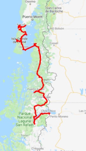 Frontiera Cile Cico – Frontiera Cilena Cile Cico – Fachinal – Puerto Guadal – Confluenza del Rio Baker con il Rio Neff – Puerto Marmol (Bahia Manza) – Villa Cerro Castillo – Coyhaique – Puerto Aisén – PN Queulat e il ghiacciaio Ventisquero – Puyuhuapi – Villa Vanguardia – Villa Lucia – Parque Pumalín – Chaitén – Playa di Santa Barbara – Isola di Chiloé