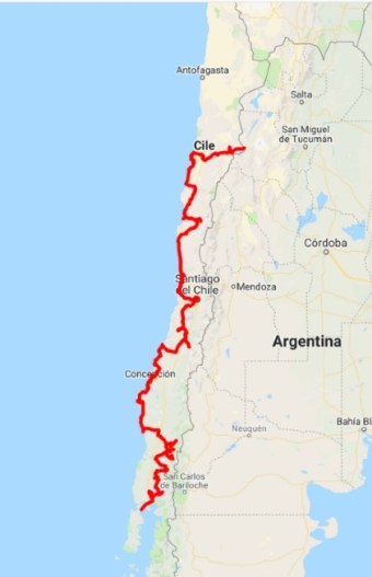 Pargua – Puerto Montt – Puerto Varas – Frutillar – Ensenada – Parque Nacional Vincente Pérez Rosales – Petrohué – Lago Ranco – Playa Puerto Llifén – Panguipulli – Puerto Fuy – Huilo Huilo – Coñaripe – Termas Geométricas – Villarrica – Parco Nazionale Huerquehue – Pucón – Temuco – Puerto Saavedra – Lebu – Lota – San Pedro de la Paz – Concepción – Cobquecura – Constitucion – Parque Nacional Radal Siete Tazas – Curicó – Santa Cruz – Lolol – Santiago – Casablanca – Valparaíso – Viña del Mar – Valle Rio Hurtado – Morrillos – Vicuña – Pisco Elqui – Vicuña – La Serena – Coquimbo – Huasco– Parque Nacional Llanos de Challe – Puerto Viejo – Playa La Virgen – Cisne – Bahía Inglesa – Caldera – Mina San José – Copiapó – Parque National Nevado Tres Cruces – Laguna Santa Rosa – Salar de Maricunga – Laguna Verde – Paso San Francisco – Frontiera Cile/Argentina