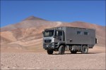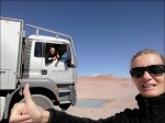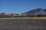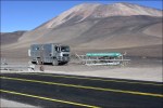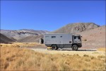 Da lì imbocchiamo la C17 che ci porta verso il passo San Francisco e vediamo il segnale che ci indica che il prossimo distributore si trova a 440 km! Questi chilometri sono tutti molto panoramici e in salita; visto che dovremo raggiungere i 4700 m s.l.m. è importantissimo acclimatarsi piano piano all’altitudine. Ci fermiamo in una larga valle attorniata di montagne di color rosa e, quando ormai il sole sta per calare, arrivano Irmi e Peter Müller di Monaco, viaggiatori di lunga data. C’è subito un bel feeling e così decidiamo di fermarci un giorno in più e di fare il possibile per rivederci a metà maggio a San Pedro de Atacama. Proseguiamo sul bellissimo tratto panoramico e prendiamo la pista a serpentina che passa attraverso il Parque National Nevado Tres Cruces e che in pochi chilometri ci porta a 4000 m s.l.m. per poi ridiscendere sull’altipiano a 3800 m. All’interno del parco vi è la bellissima Laguna Santa Rosa, dove in estate i fenicotteri la fanno da padrone. In seguito, continuando il nostro viaggio, raggiungiamo la dogana cilena. In pochi minuti sbrighiamo le pratiche doganali. Se non fosse stato per l’aria rarefatta che incontriamo a quest’altitudine (che a Gloria causa mal di testa) saremmo sicuramente rimasti un giorno sulla riva della laguna Salar de Maricunga, in questa stagione la temperatura notturna scende a -10°C. Ripercorriamo a ritroso i 10 km e proseguiamo in direzione della dogana argentina che si trova a 130 km di distanza. La strada non presenta tornanti ma sale costantemente, così come il consumo del Nimbus che, oltre alla salita, deve fare i conti con l’aria rarefatta. A 4300 m s.l.m. raggiungiamo la ventosa Laguna Verde che, anche se bella, non soddisfa le nostre aspettative, specialmente per il forte vento. Continuiamo e a 4748 m s.l.m. raggiungiamo il Paso San Francisco che delimita il confine tra Cile e Argentina. Da quest’altezza i vulcani che costellano i dintorni e superano i 6000 m non sembrano neanche così alti.