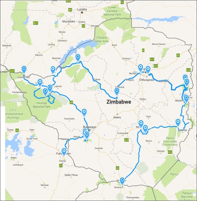 Frontiera Ramokwebane Botswana/ Plumtree Zimbabwe – Matobo NP – Bulawayo – Hwange NP – Victoria Falls – Mlibizi – Binga – Nenyunka – Kwekwe – Lake Chivero – Harare – Nyanga NP – Honde Valley – Mutare – Bvamba Mountains – Chimanimani – Lake Mutirikwe – Great Zimbabwe – Masvingo – Frontiera Beitbridge Zimbabwe/Sudafrica